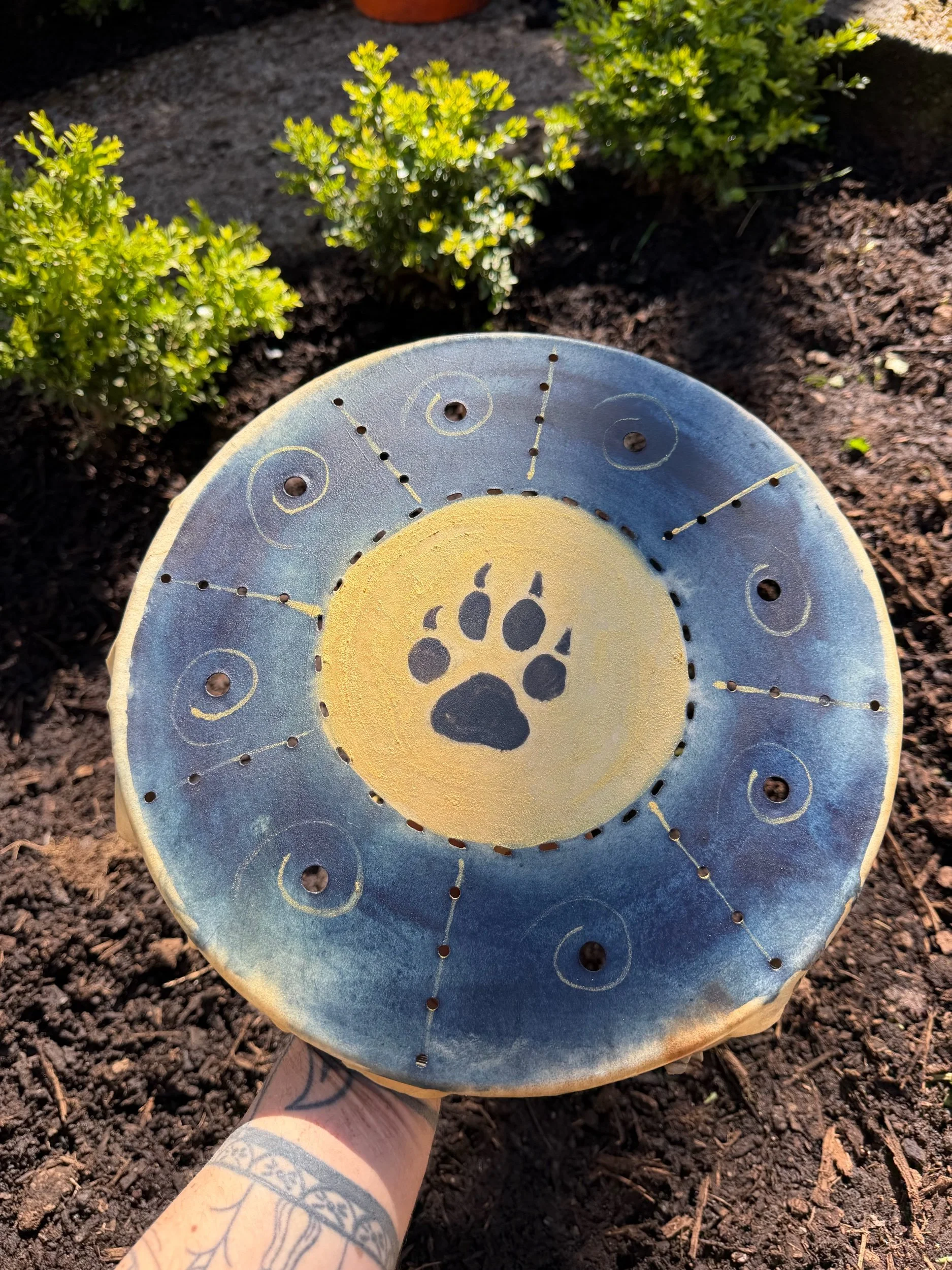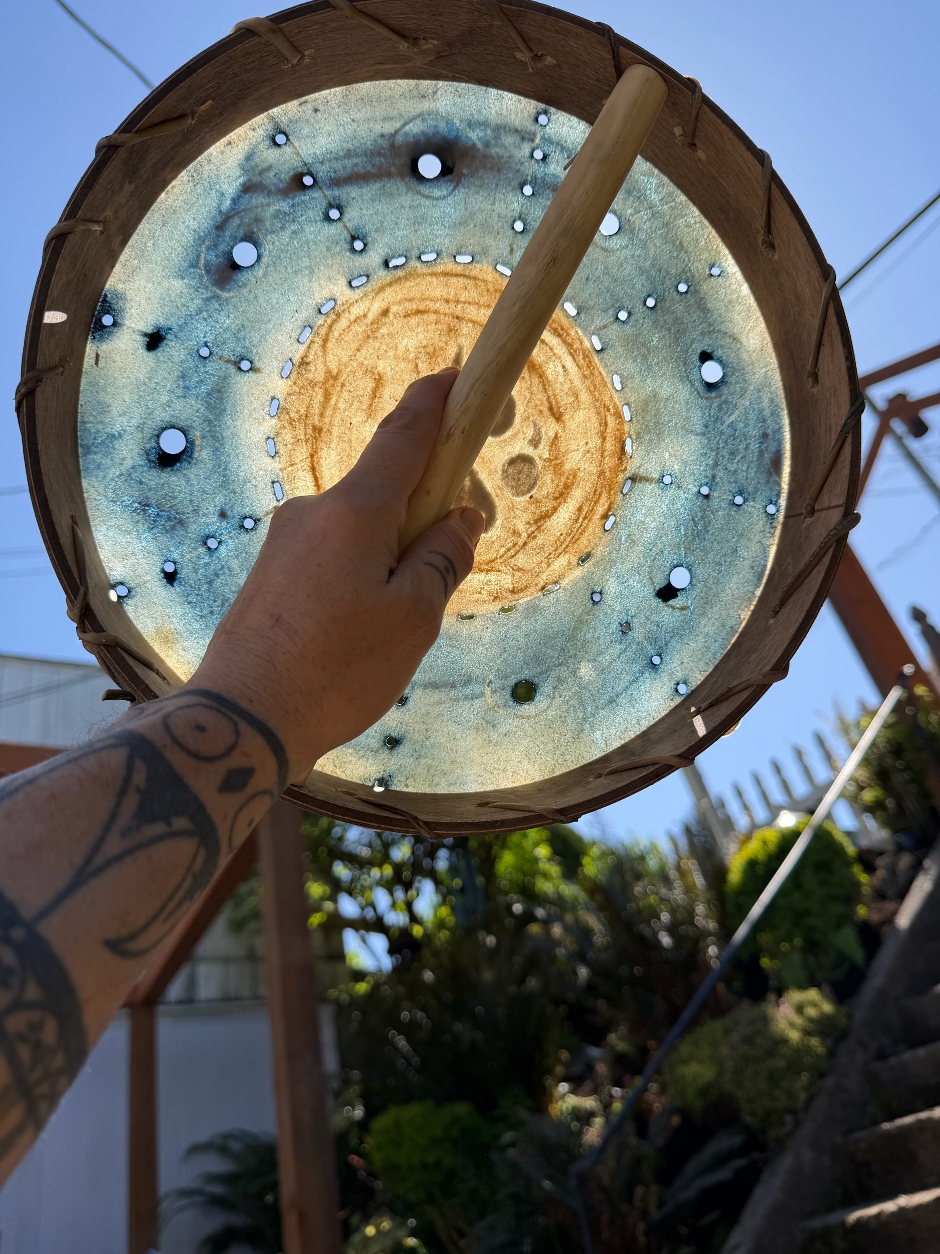 The holes themselves are said to have come about in a few ways, in the way it was told to me it was because our drums and instruments would be broken to help kill our singing and dancing that it helped disguise them as tools for sifting seeds etc. As a type of colander. So for me I love to make the holes in the drum now as a sign of resistance.