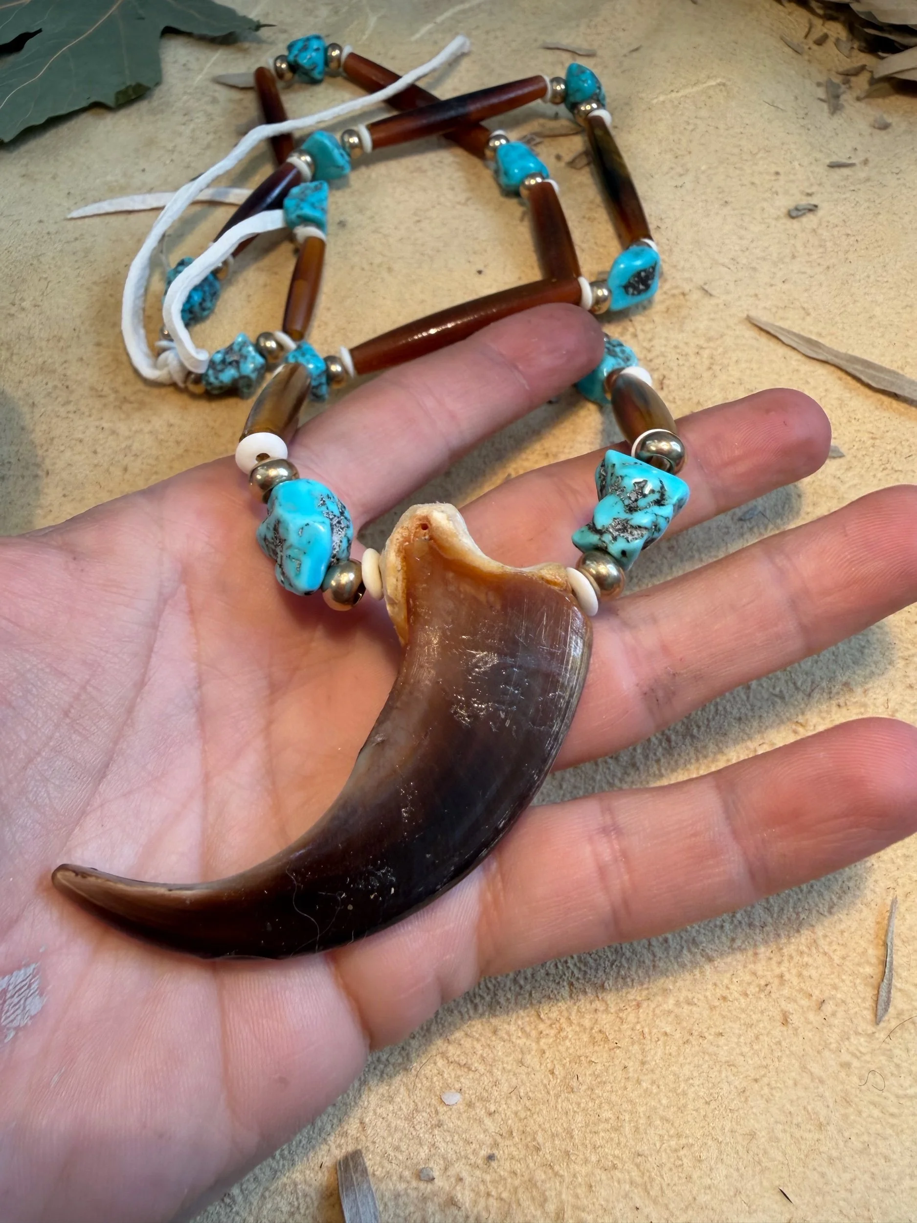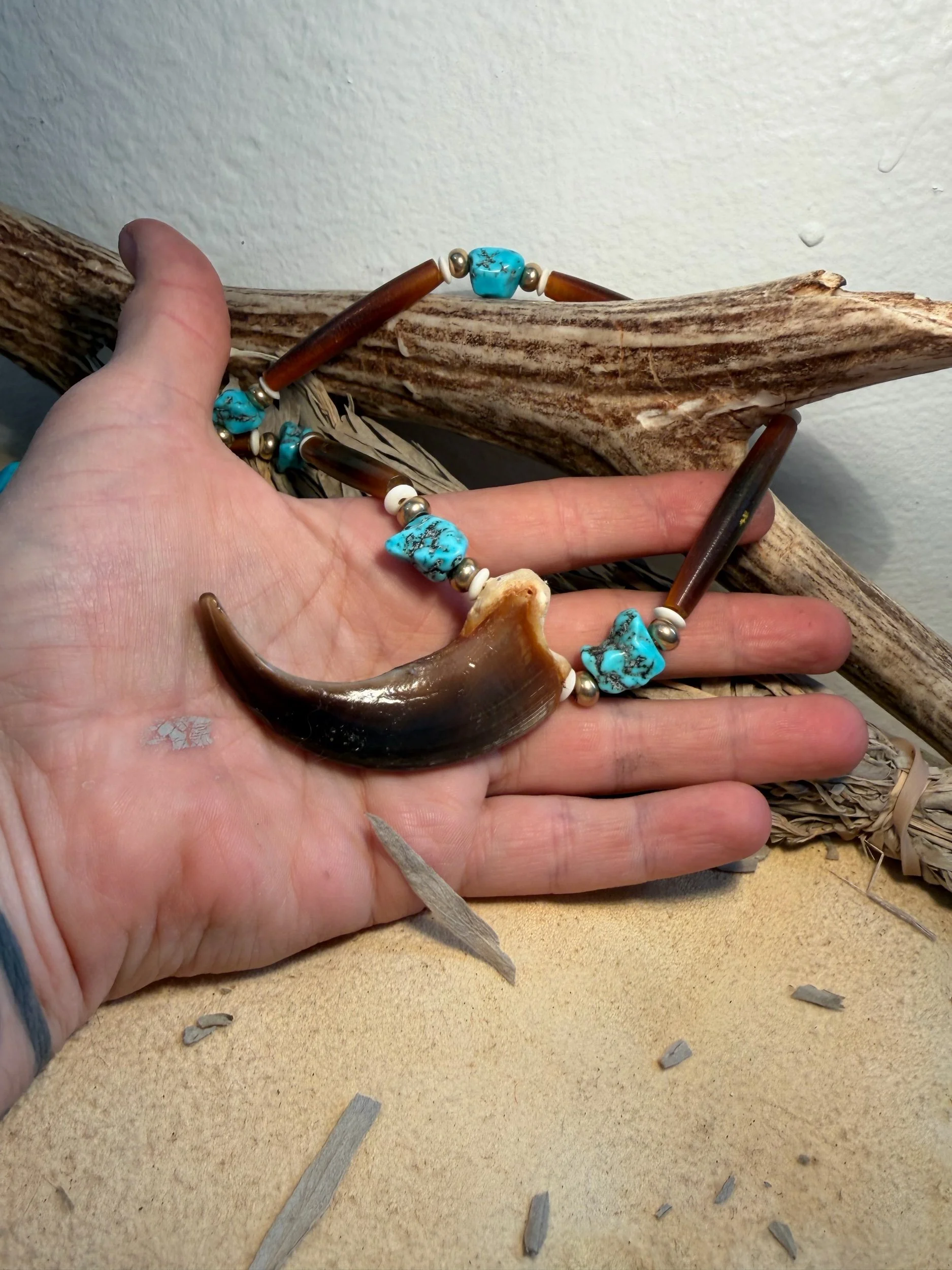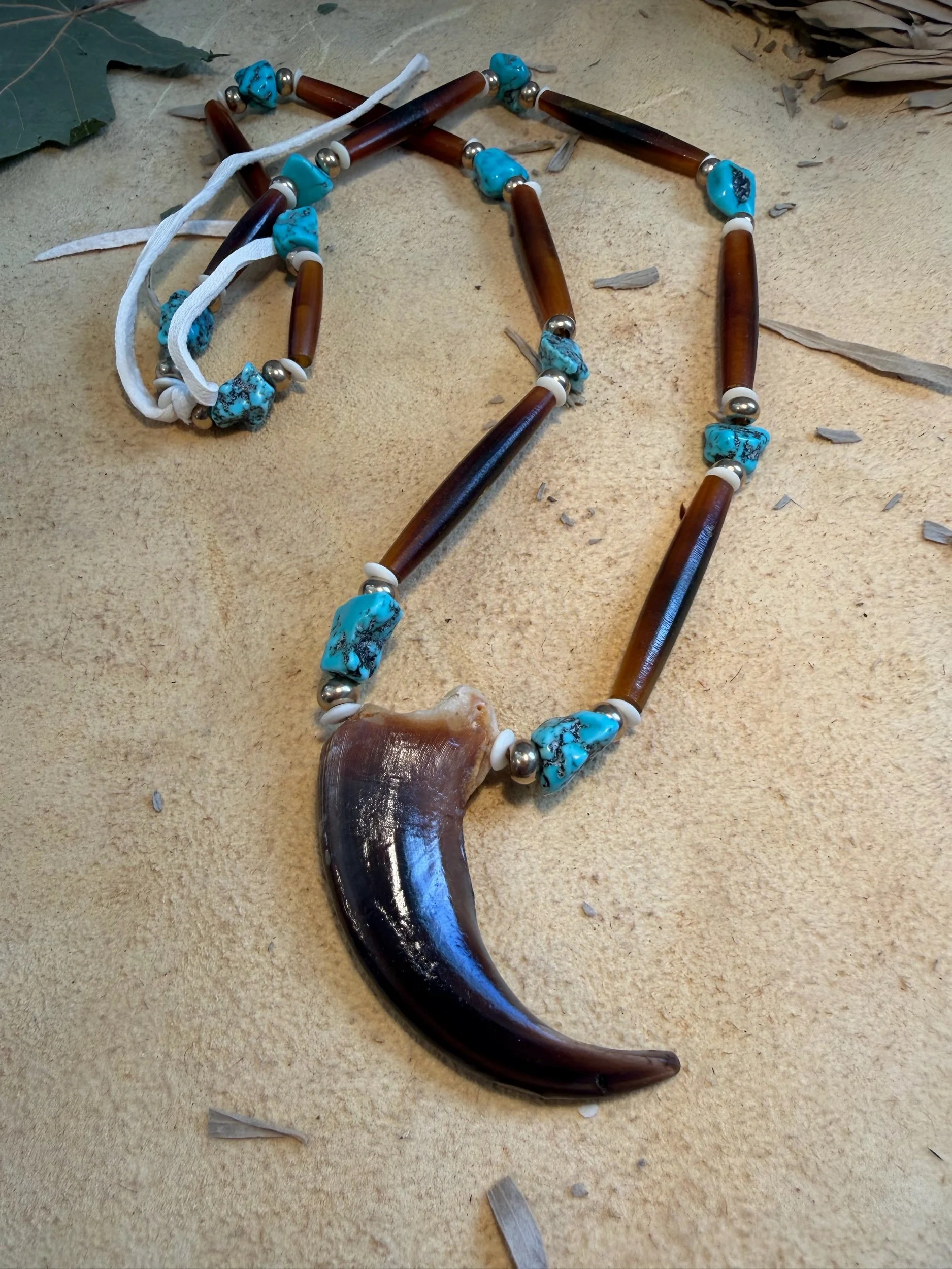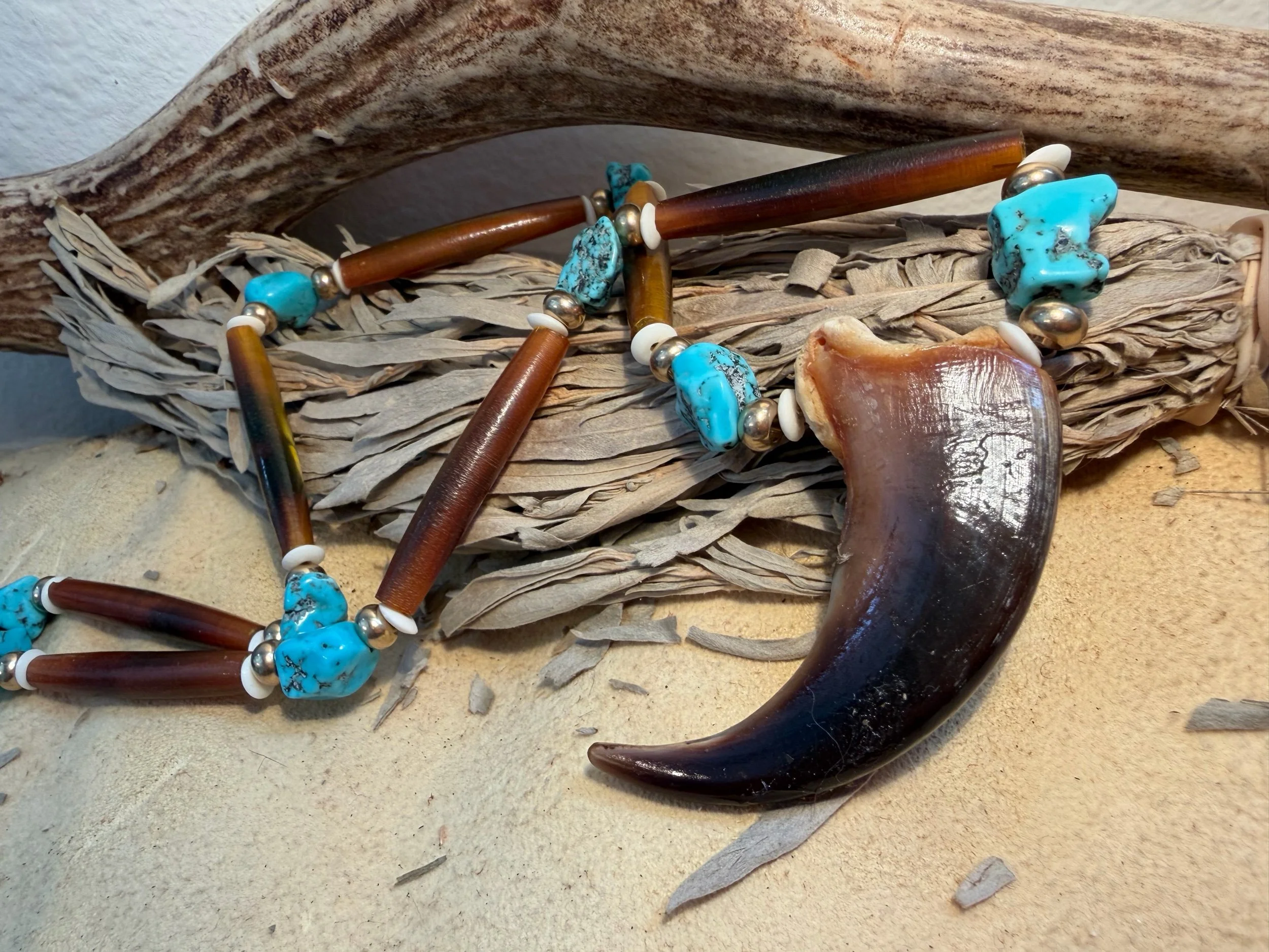 28” cord Authentic rough cut turquoise beads with solid brass bone and horn.