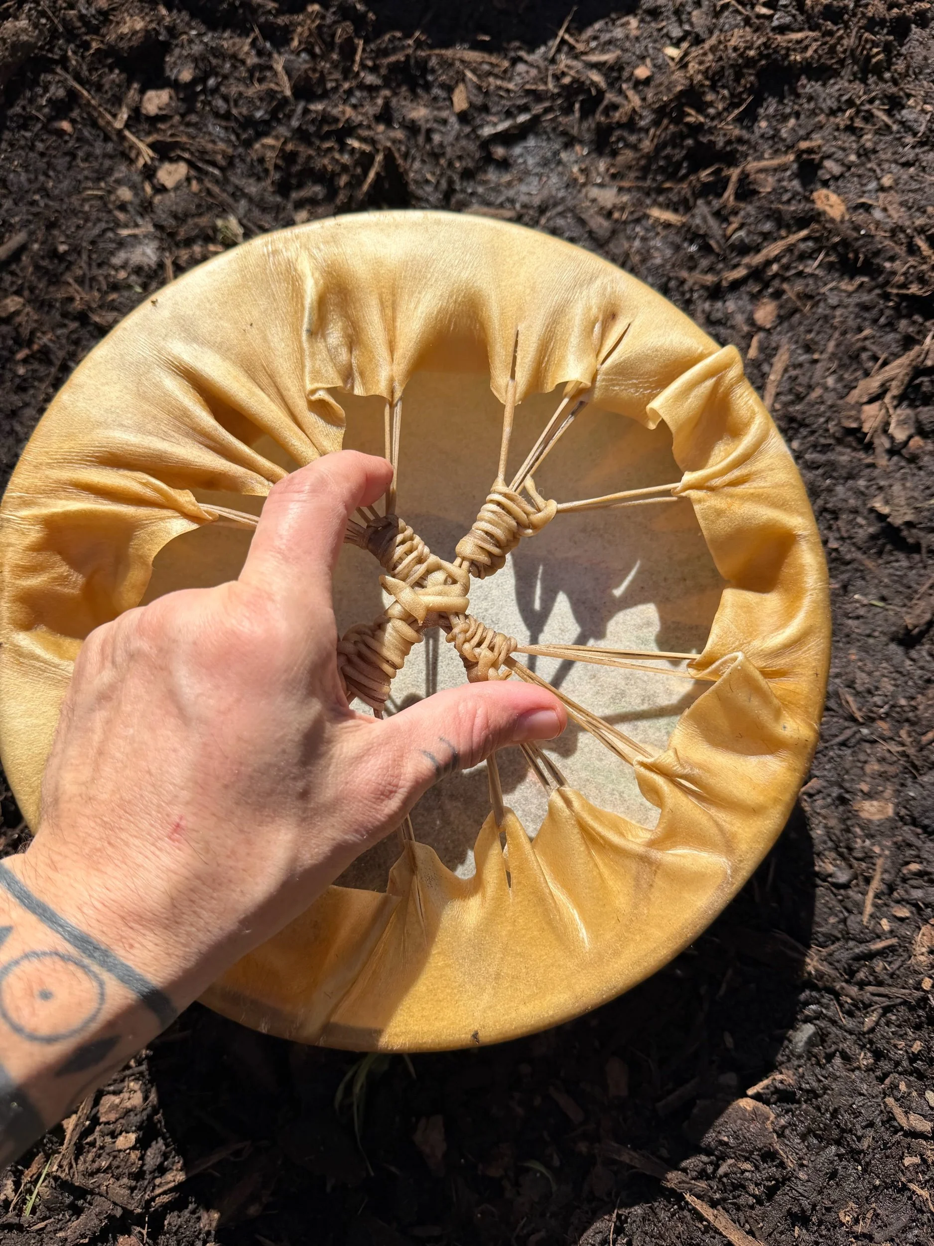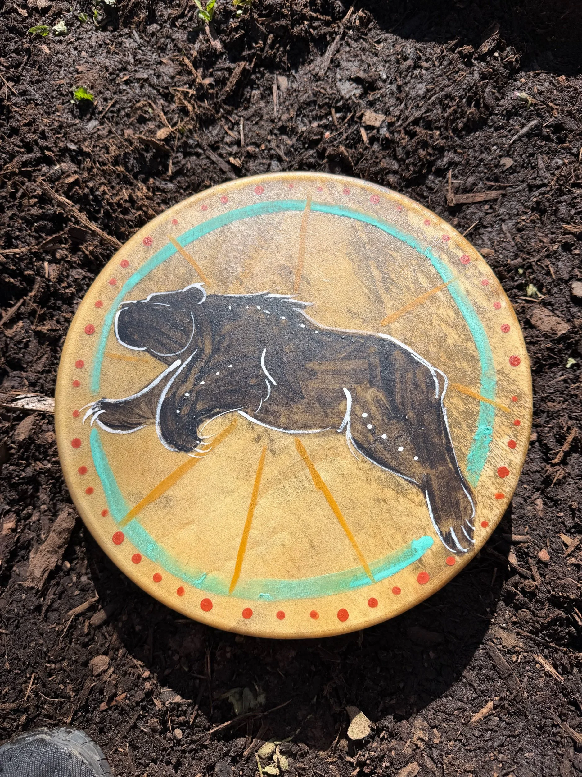 Earth pigment paints painted while wet and stained into the head of the drum